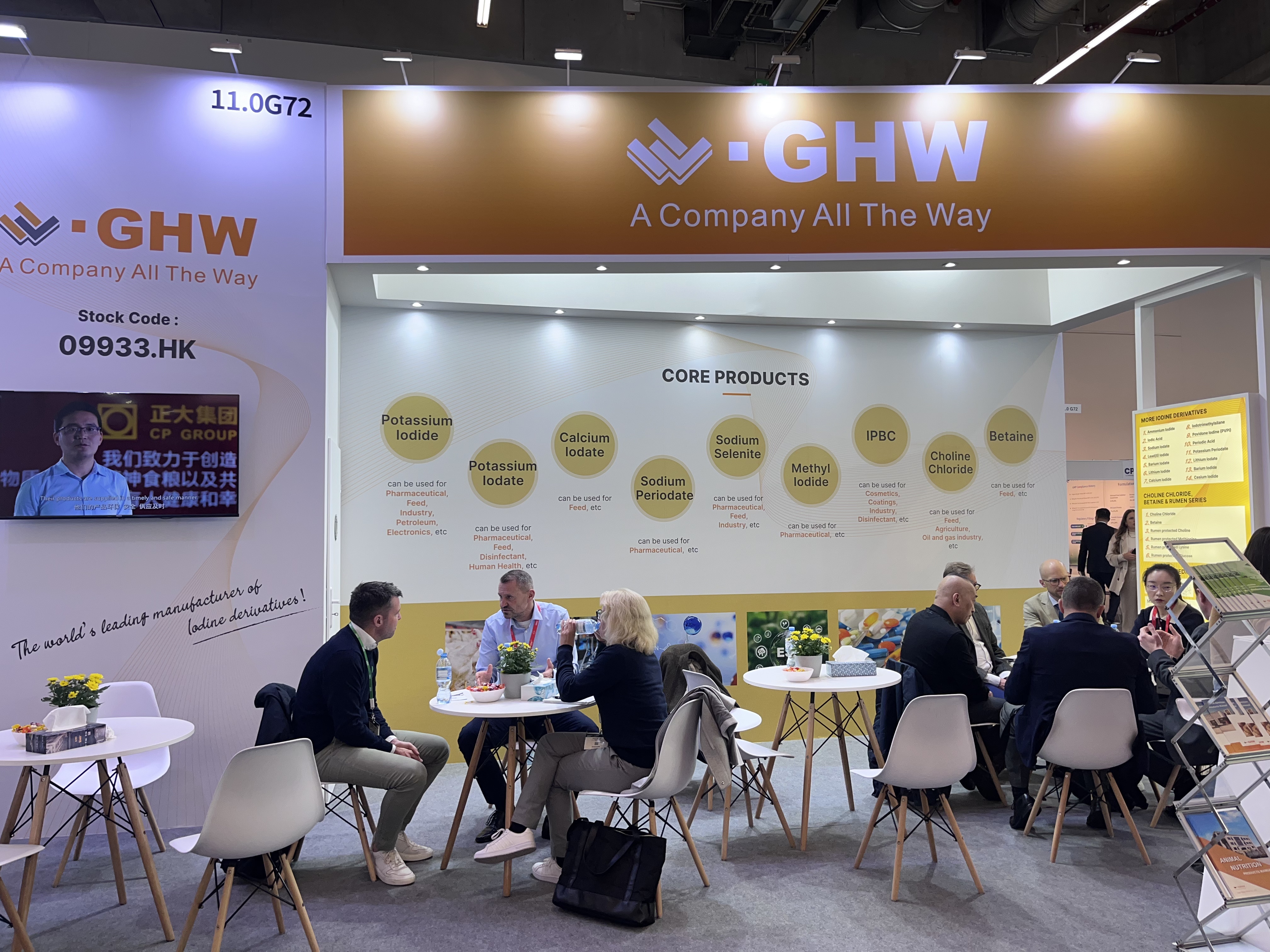 Sur le stand, nos équipes ont mis en avant plusieurs de nos produits clés, tels que iodure de potassium, iodate de potassium, iodate de calcium, periodate de sodium, sélénite de sodium, iodométhane, IPBC, chlorure de choline, bétaïne, etc.